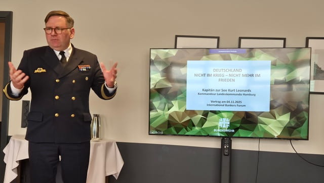 Am 4. November 2025 fand im Hafen-Club Hamburg eine Veranstaltung der Hamburger Finanzplatzgespräche unter der Leitung von Petra Helf statt. Referent war der Kommandeur des Landeskommandos Hamburg, Kapitän zur See Kurt Leonards. Vor 15 Teilnehmern stellte Kapitän Leonards die geänderte Sicherheitslage Deutschlands und seiner Verbündeten in Europa in der Folge des Kriegs Russlands gegen die Ukraine dar. Anhand von Beispielen aus der jüngeren Vergangenheit legte Kapitän Leonards die aktuelle hybride Kriegsführung Russlands dar. Diese reicht von Drohnenangriffen auf Polen, Verletzung des Luftraums baltischer Staaten bis hin zu Störung des Luftverkehrs auf westeuropäischen Flughäfen durch Drohnen und Angriffen auf die IT-Infrastruktur. Ebenso hätten Schiffe in der Ostsee mehrfach Kabel mit ihren Ankern durchtrennt, die sie über lange Strecken hinter sich hergezogen haben.