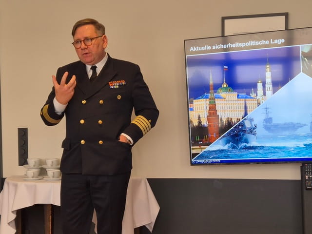 Kapitän Leonards stellte dar, dass sich der Auftrag der Bundeswehr seit 2022 grundlegend von der Intervention in Krisengebieten wie Afghanistan und Mali hin zur Landes- und Bündnisverteidigung geändert hat. Das bedeutet u.a. grundlegend andere Anforderungen an die Ausrüstung der Bundeswehr sowie an deren Personalstärke. Da in einem Krisenfall die Mehrzahl der aktiven Soldaten an der Front wäre, ist die Bundeswehr zudem dabei Heimatschutzkommandos aufzubauen.